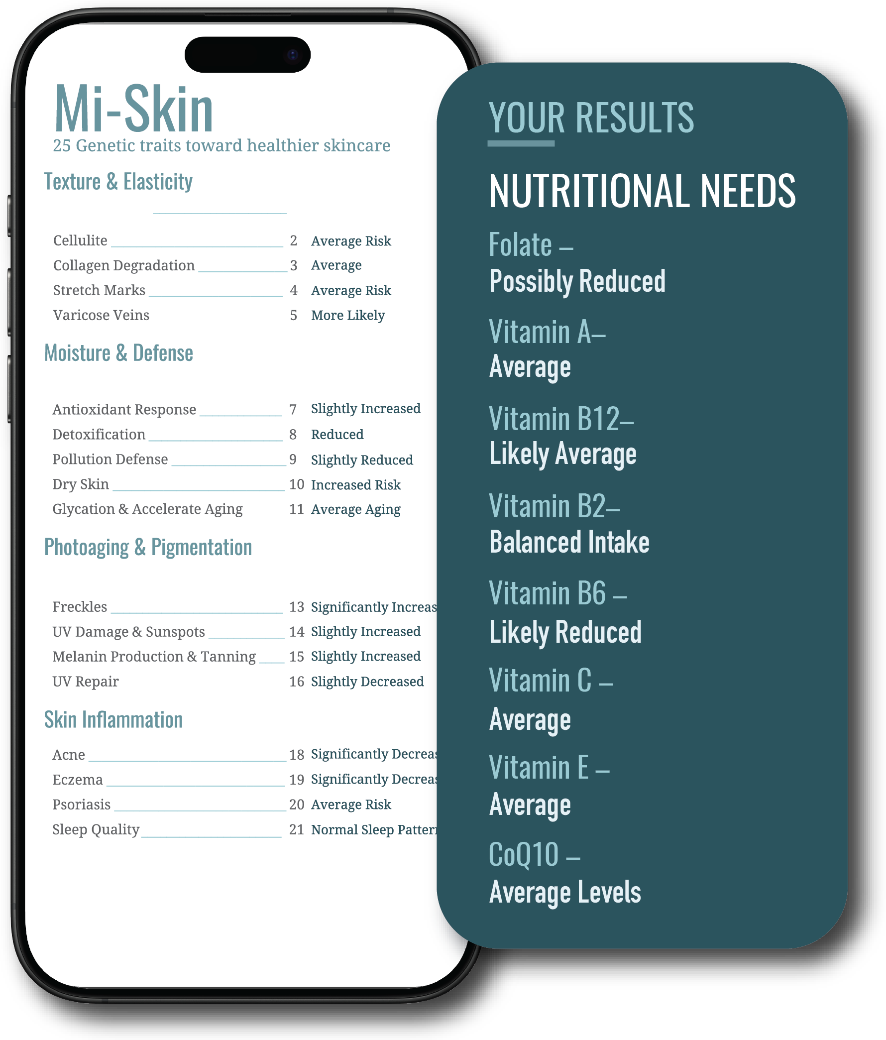 25 Genetic traits toward healthier skincare. You’ll learn about your genetic tendencies and vulnerabilities, from complexion to nutritional deficiencies.