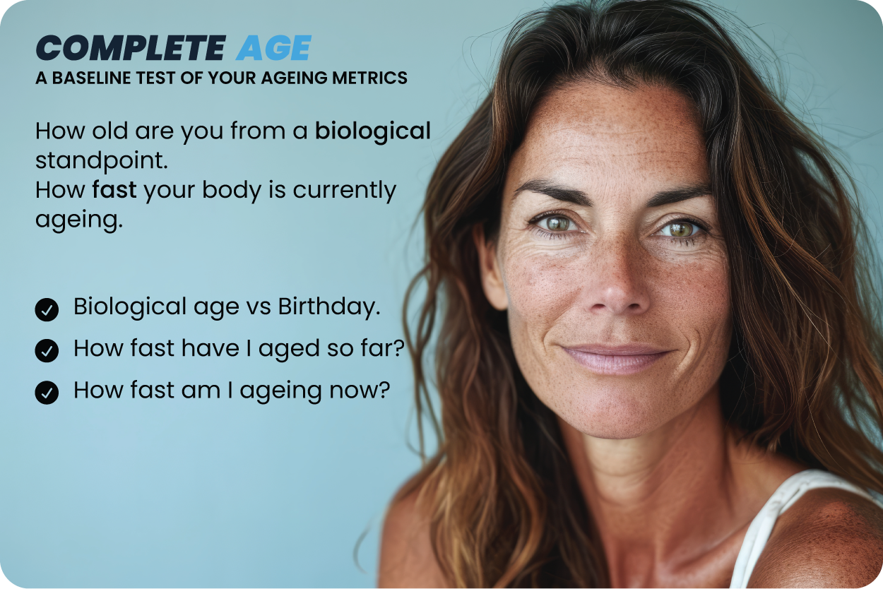 COMPLETE AGE tells you how old you really are from a biological standpoint, and analyzes how fast or slow your body is currently ageing on a cellular level. This test includes the PACE OF AGING test.